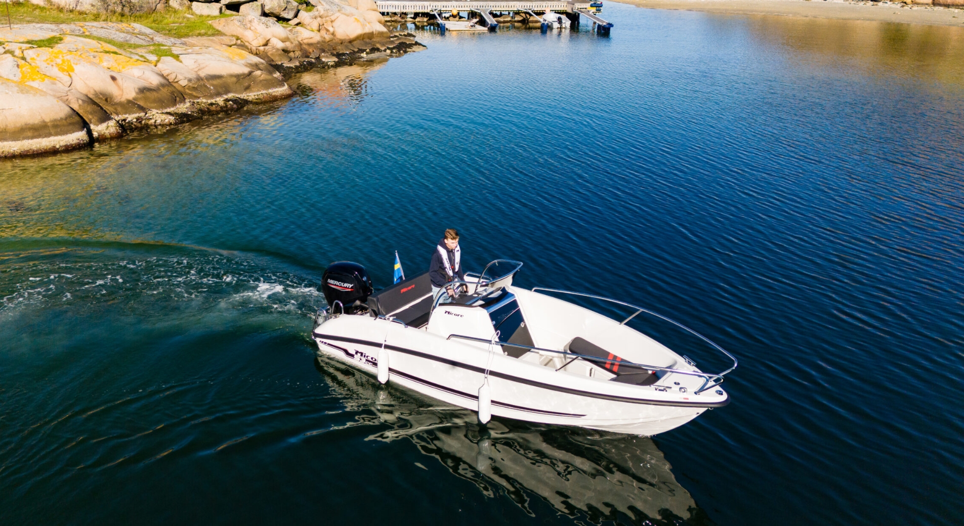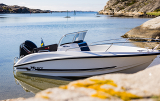 Med höga fribord och kaxiga linjer är bilarnas SUV inspirationskällan för designkänslan i den här båten. Den lägre vikten gör den dessutom väldigt lättrailad. Vi har här valt att göra en bekväm formgjuten soffa så långt bak i båten som möjligt vilket gör att man sitter väldigt stabilt eftersom båten rör sig som minst desto längre bak man sitter. Under sittbänken i aktern finns ett kapellgarage för den som vill ha ett akterkapell. Båten är utrustad med ankarbox i fören och aktern samt fyra stycken stuvar inuti båten. Stuven i styrkonsolen är väl tilltagen. I luckan till stuvfacket i pulpeten finns ett ledljus som lyser upp Micore logotypen när mörkret faller in.